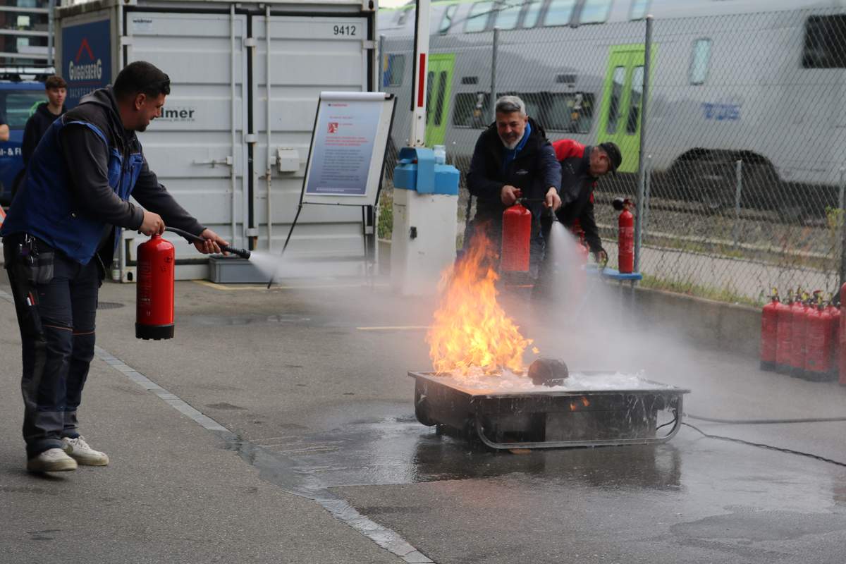 Für einen besonderen Adrenalinkick sorgte anschliessend der dritte – und wohl spektakulärste – Programmpunkt auf dem Vorplatz: das praktische Brandschutztraining. Ausgerüstet mit Handfeuerlöscher und Löschdecke sollten die Mitarbeitenden ein echtes Feuer unter Kontrolle bringen. Unter Anleitung eines Brandschutztrainer der Firma Contrafeulernten die Guggisberg-Mitarbeitenden, wie schnell ein Brand entstehen kann – und wie wichtig ruhiges, überlegtes Handeln im Ernstfall ist.