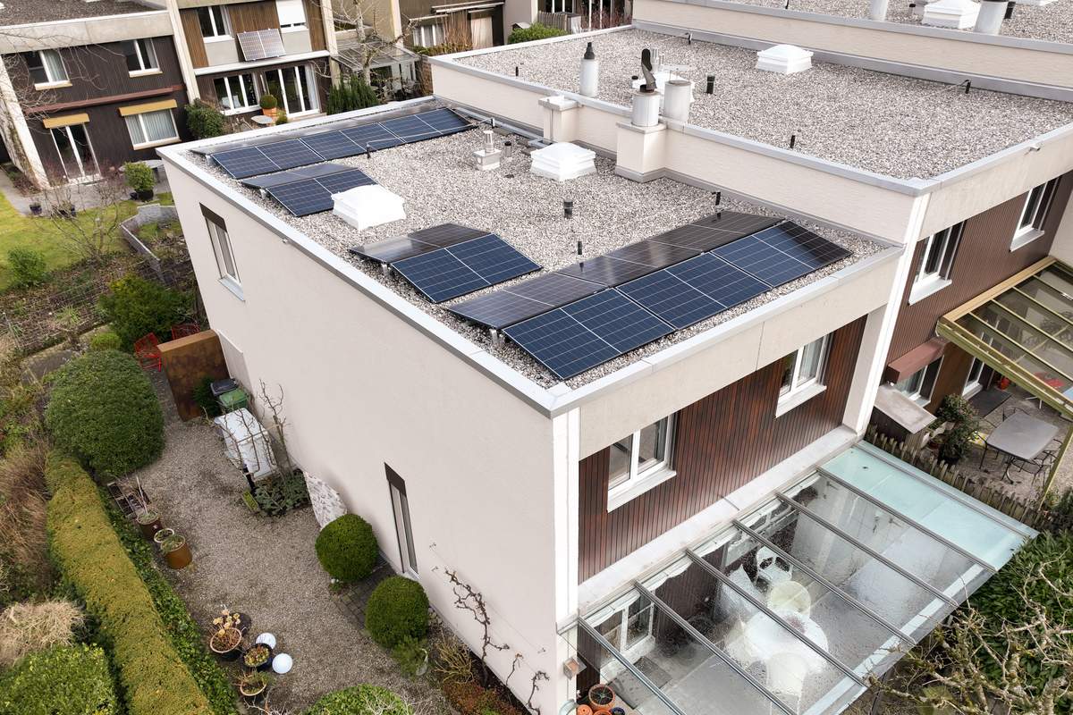 Für die Leitungsführung konnte ein bestehender, nicht mehr genutzter Kamin als Steigzone verwendet werden. Ergänzend zur Anlage wurde ein Batteriespeicher mit einer Kapazität von 5 kWh installiert. Ein integriertes Energie-Managementsystem ermöglicht es der Bauherrschaft, den Eigenverbrauch zu optimieren und überschüssige Energie gezielt in die Batterie oder in die Wärmepumpe einzuspeisen.